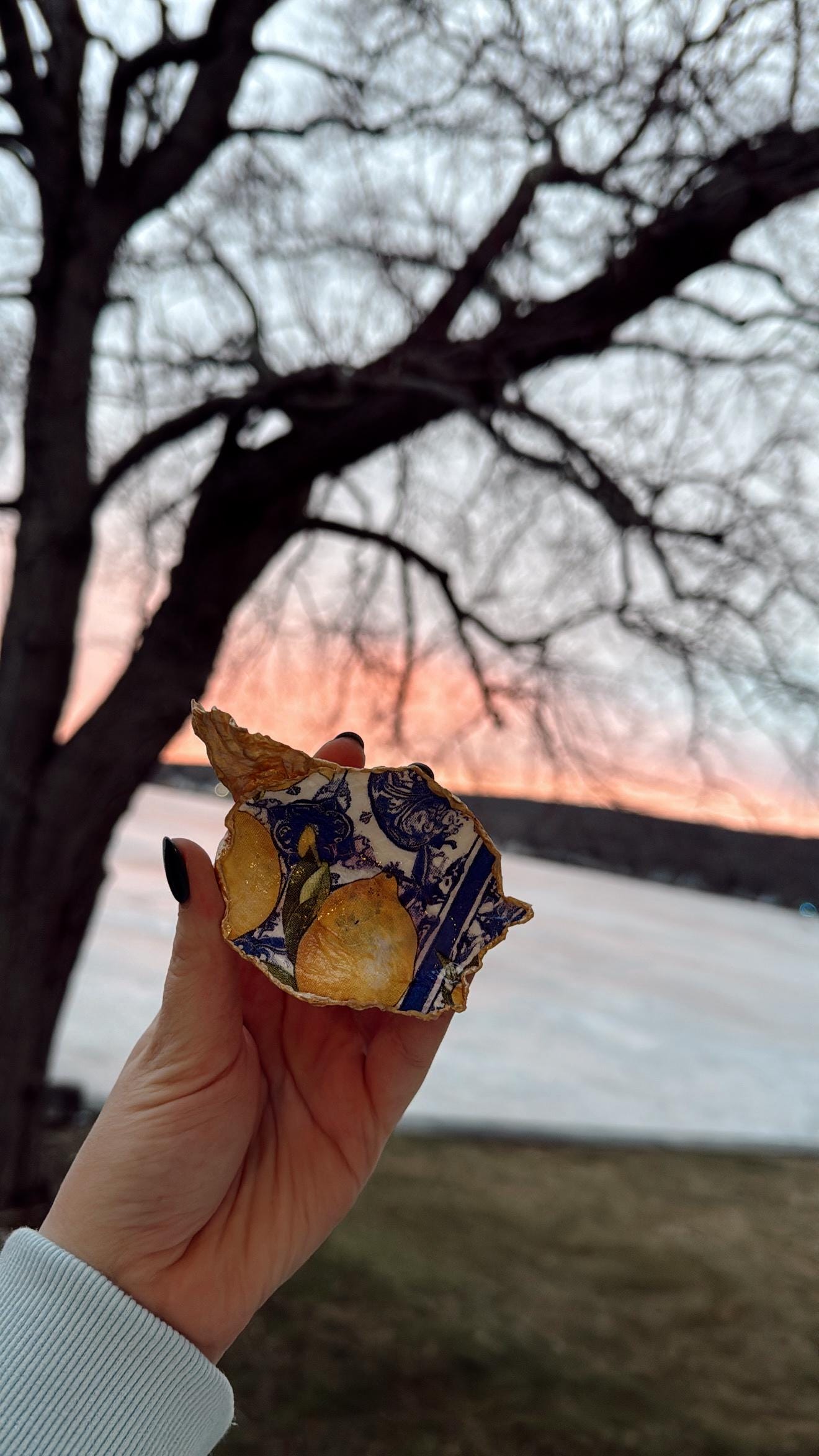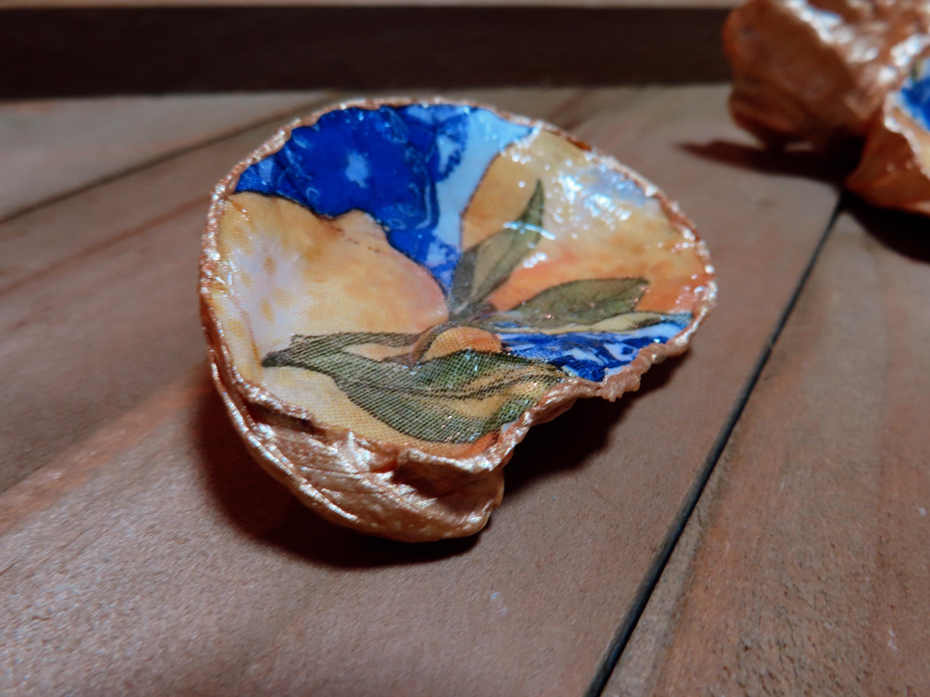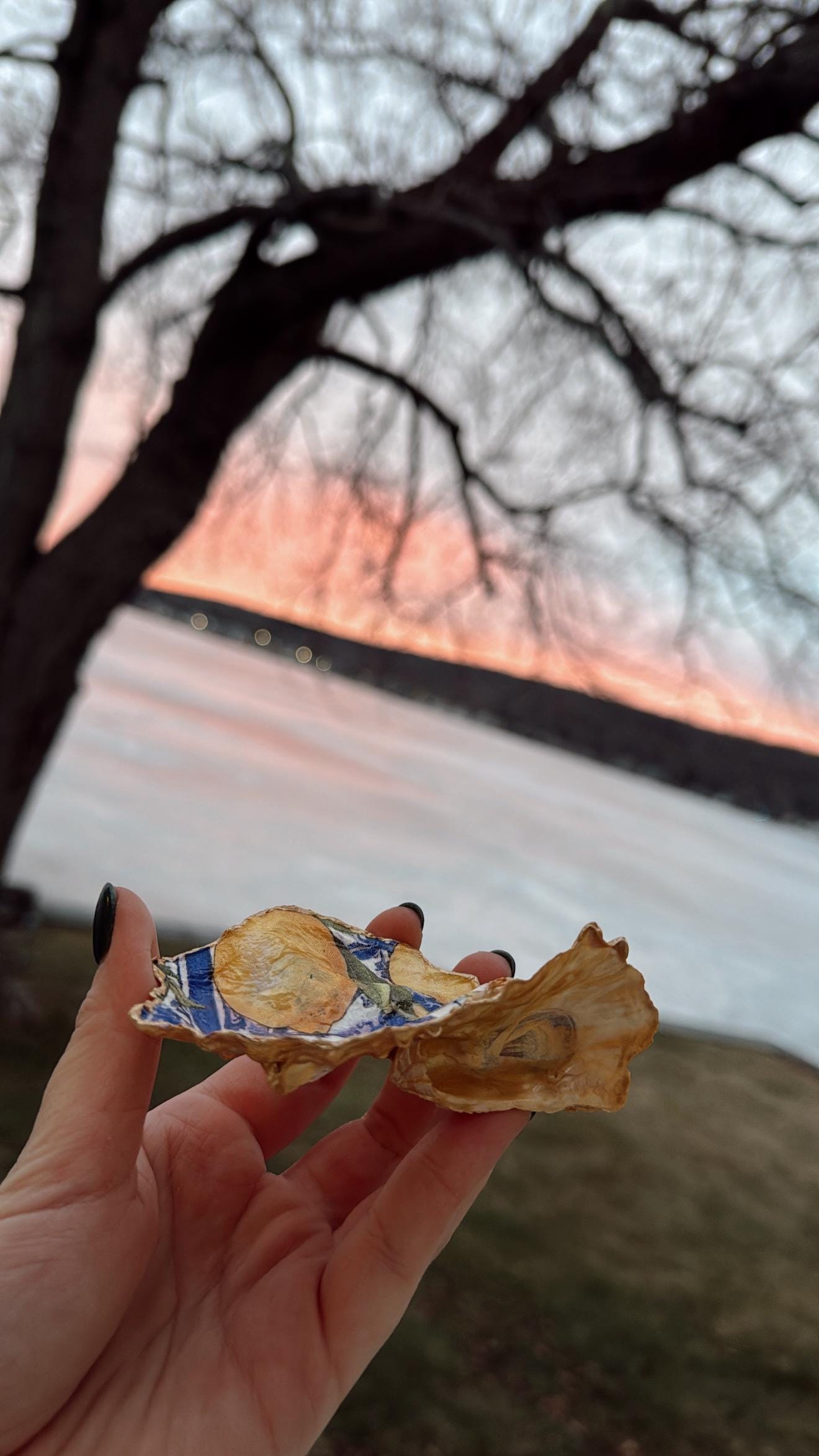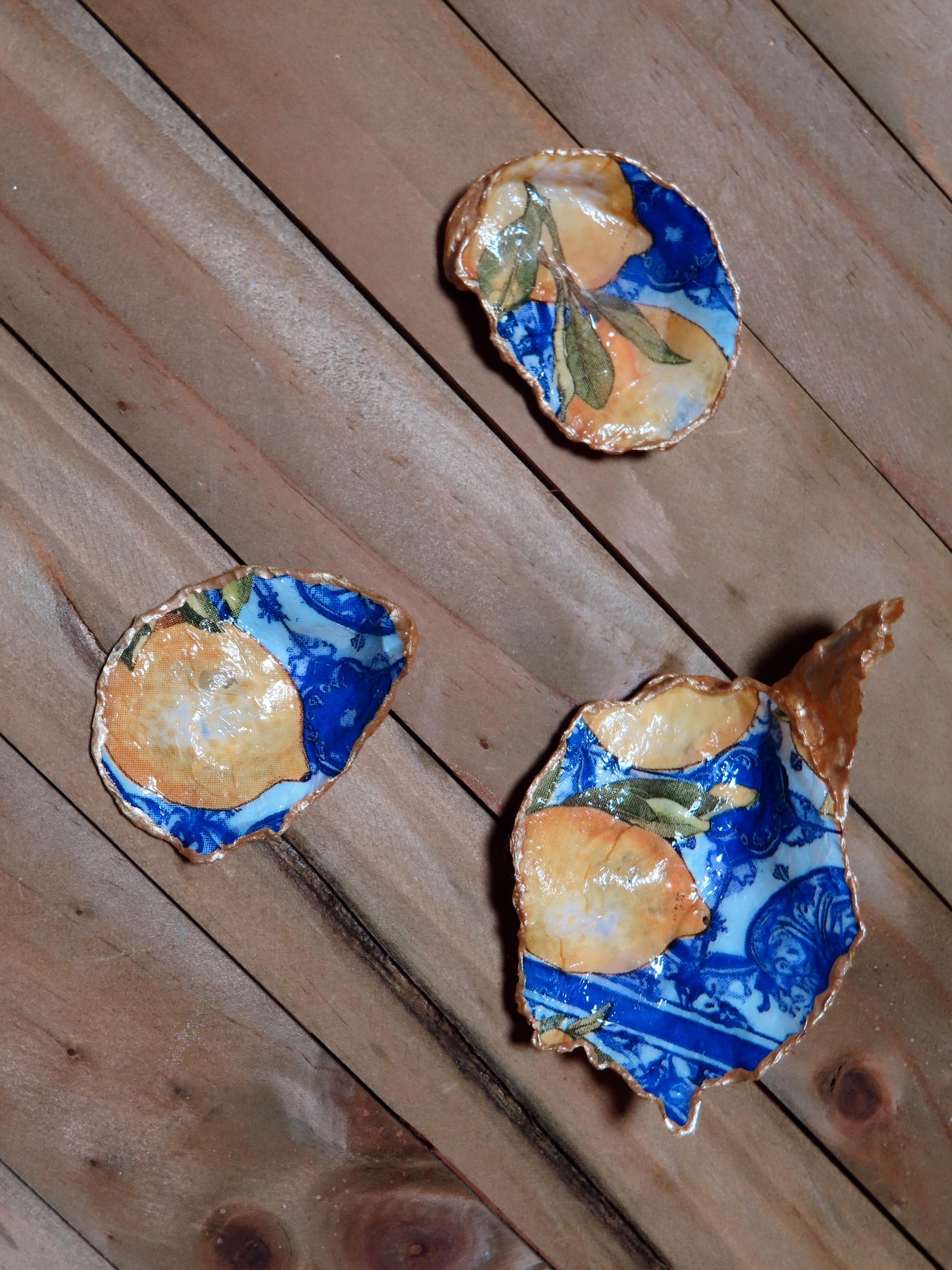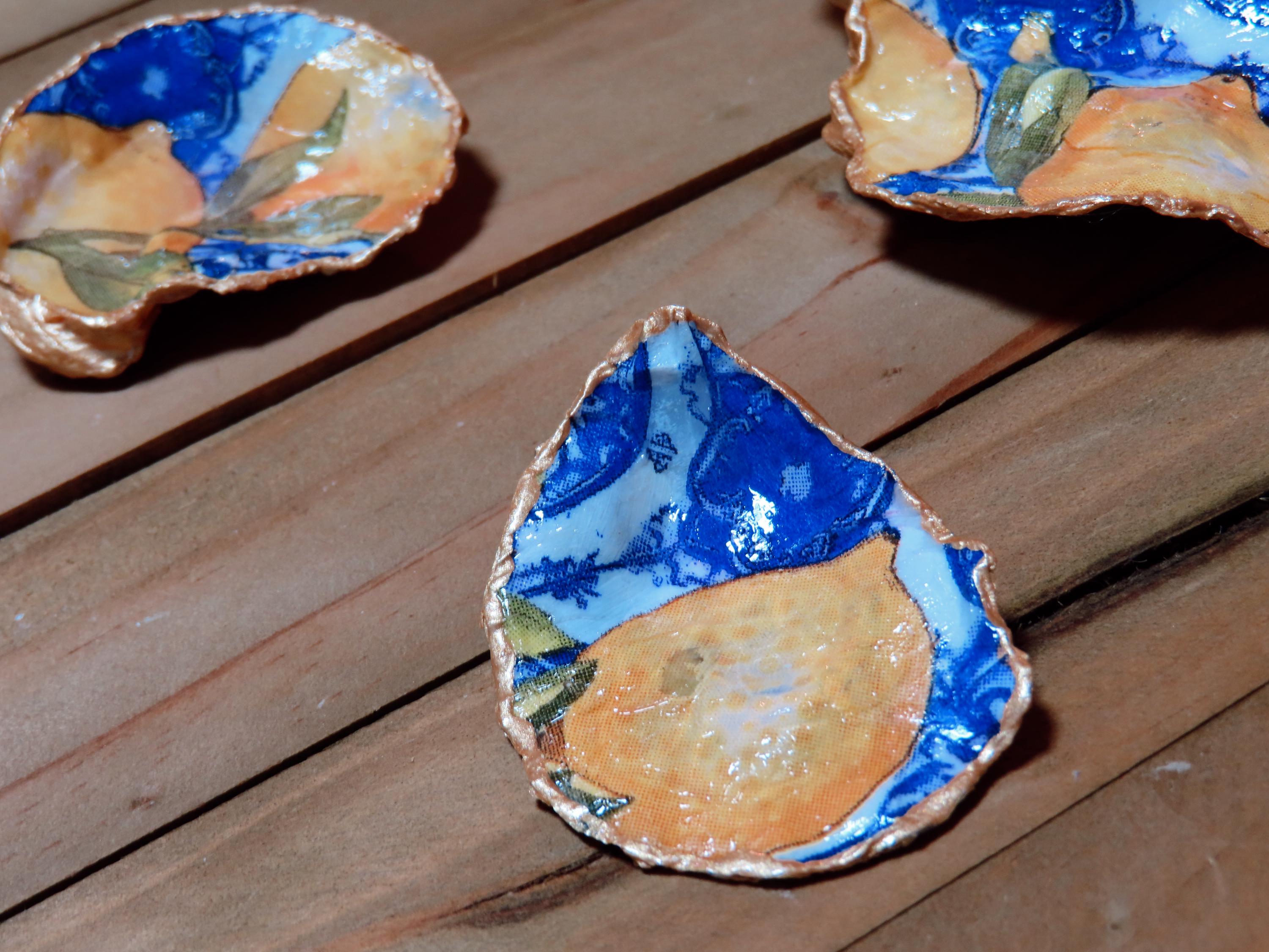 Each natural oyster shell is carefully cleaned, decoupaged with vibrant blue Mediterranean tile patterns and citrus lemons, and finished with a hand-painted gold rim and back for an elegant coastal look.