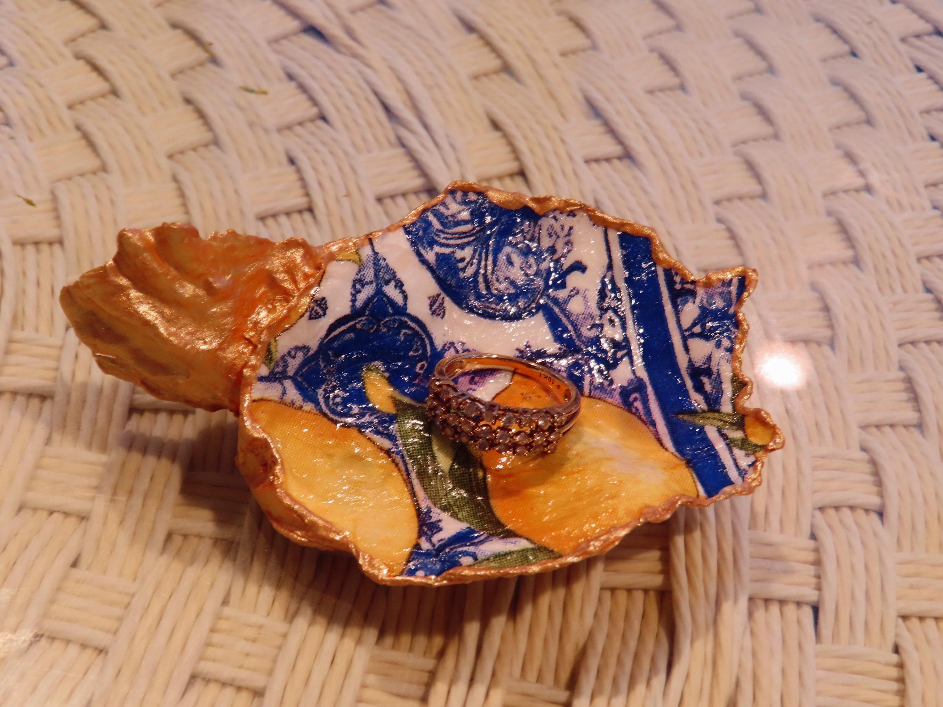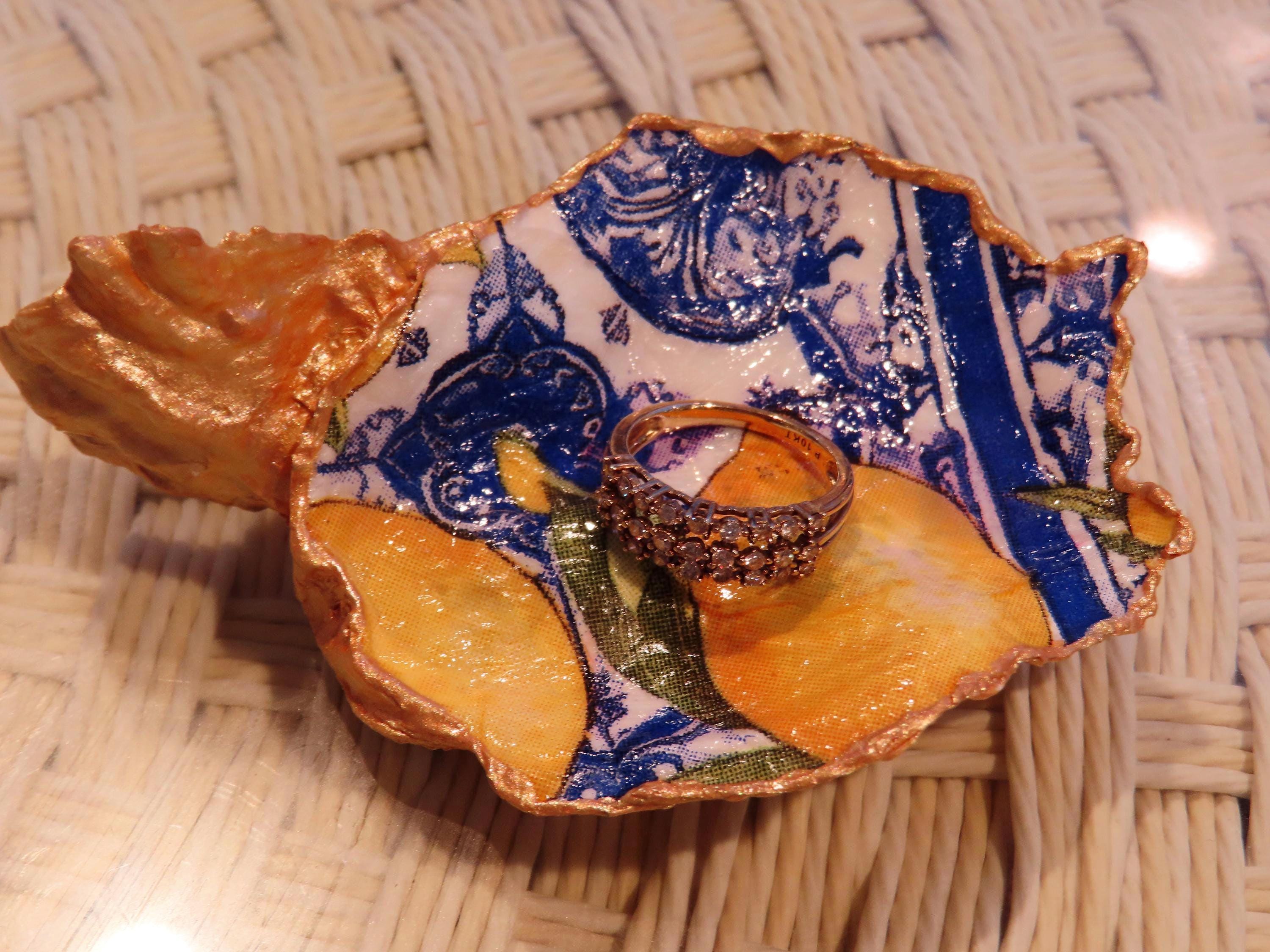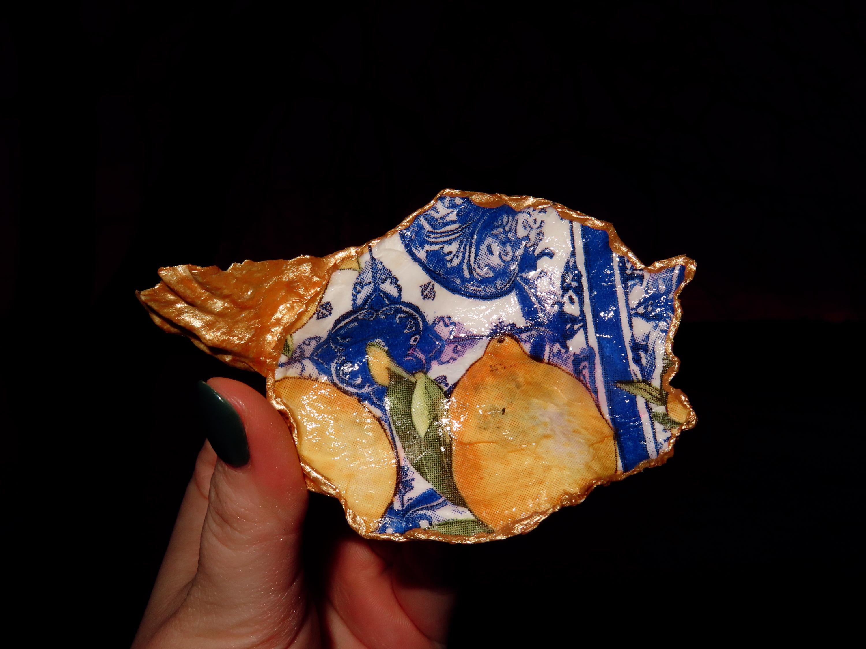 Handmade decoupage oyster shell ring dish featuring blue & white Italian tile and lemons with a gold rim -- perfect for jewelry, gifts, or coastal decor.
