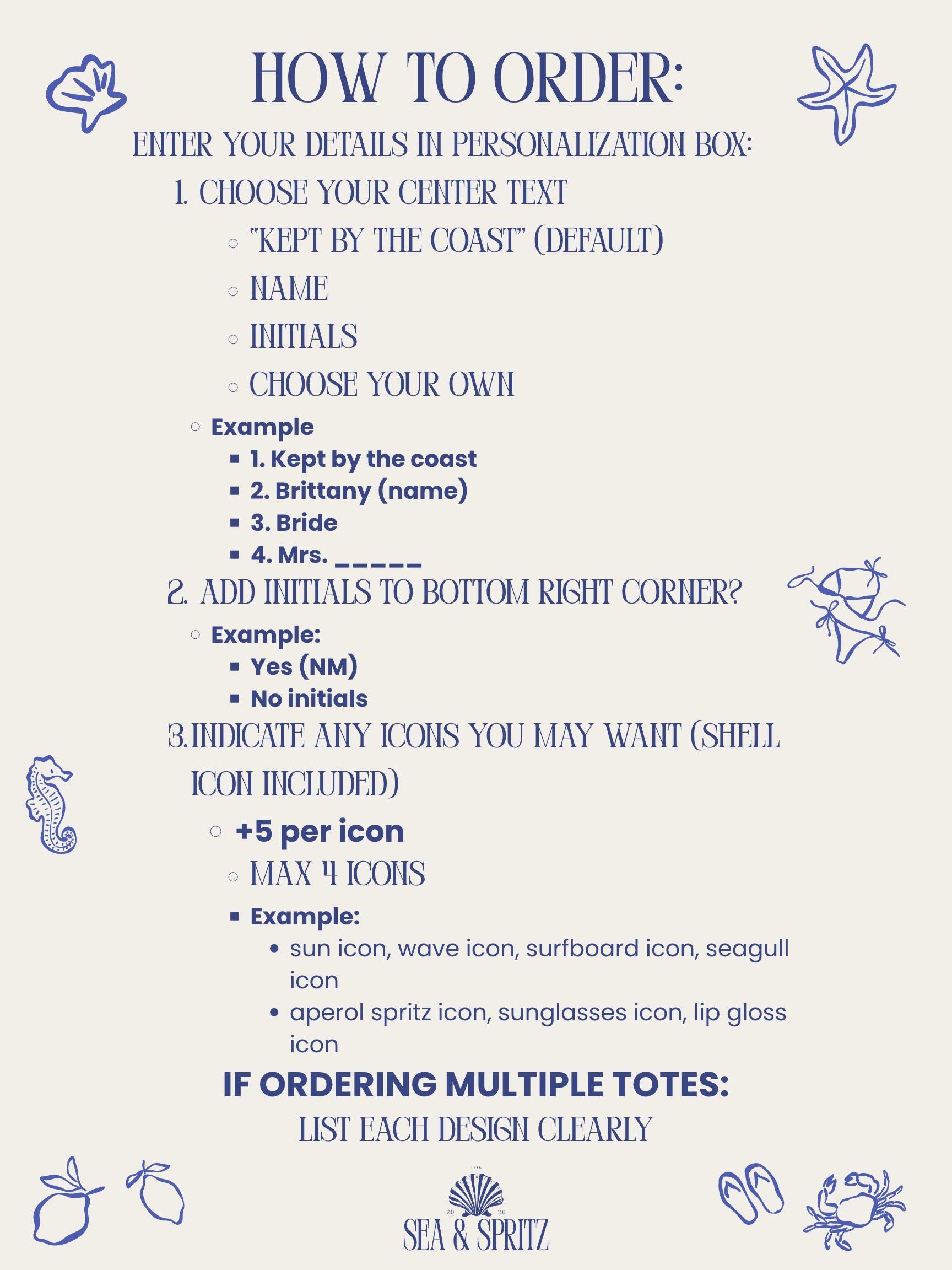 This personalized canvas tote is designed for slow beach days, summer errands, and everything in between. Featuring your choice of custom text, optional initials, and hand-placed coastal icons, each bag is made to feel uniquely yours.